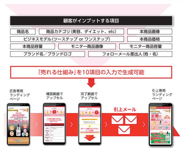 フローを構築するにあたって専門的な知識が一切なくても、「最強の売れるノウハウ🄬クリエイティブ自動製作」という機能を有しており、簡単に売れる仕組みを作ることができるサービスとなっています。