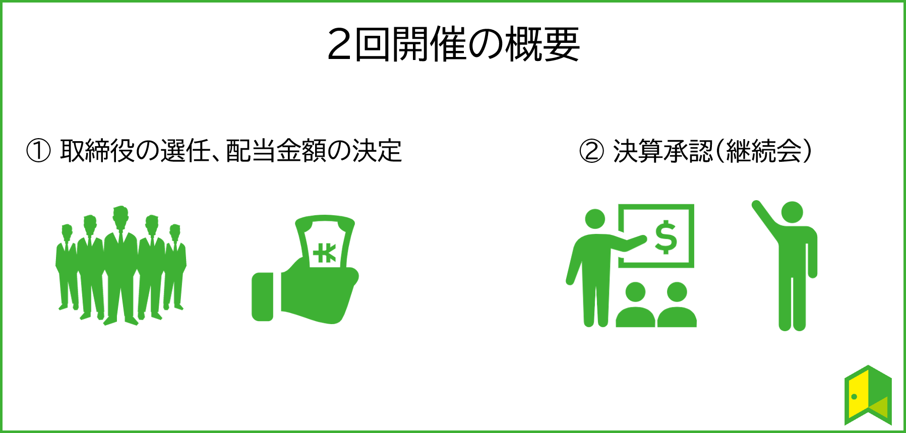 この場合、まず一回目の株主総会では取締役の選任・配当金額などを決定します。
