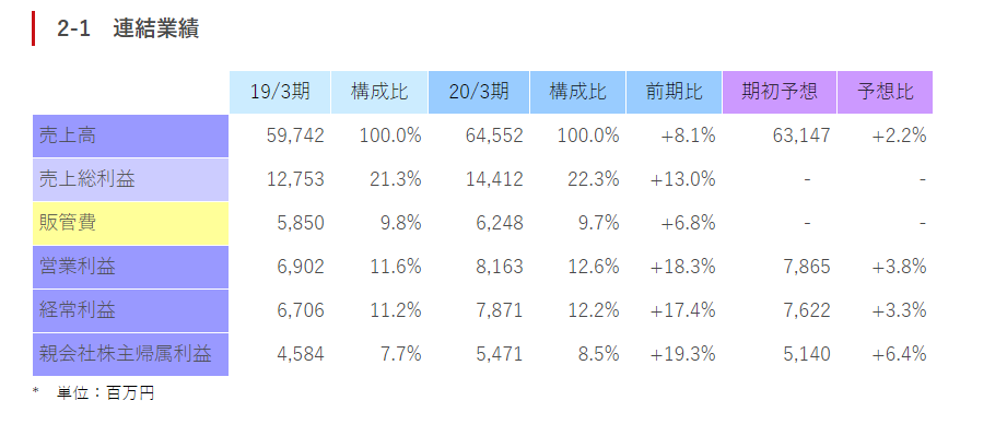 20年3月期は売上高が645億円と前期比8.1%増、営業利益は81億円と18.3%増となっていて、増収増益となっていることが分かります。