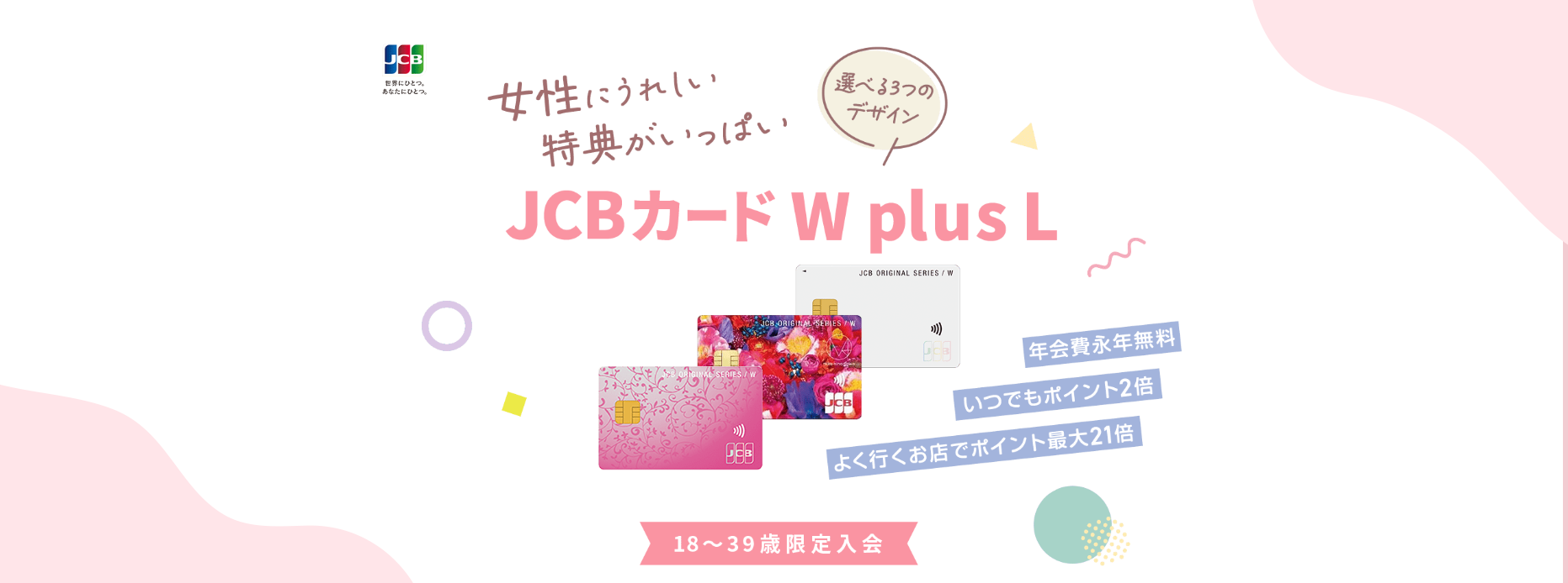 JCB カード W plus Lは還元率が高く、18歳~39歳の方なら年会費無料で発行できます。