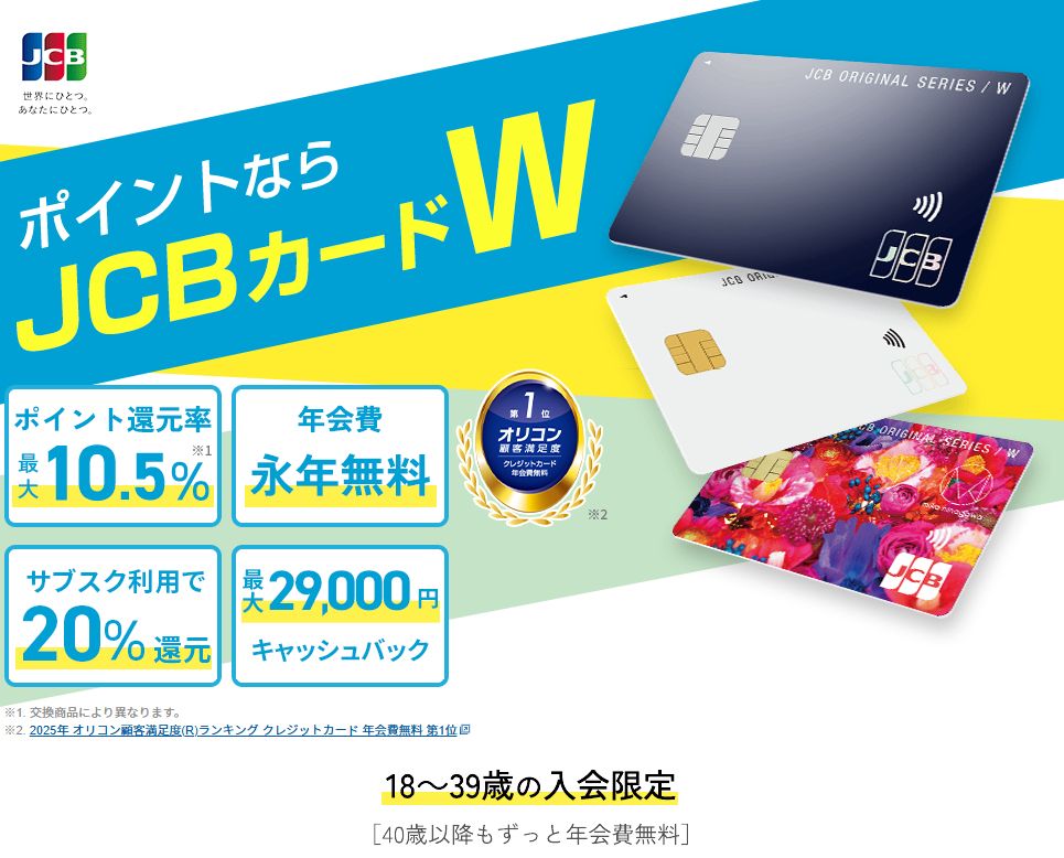 JCBカードWは、18歳~39歳までの人が入会できる年会費無料のカードです。