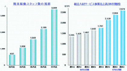 2007年5月期は、前期比で1,200名増加しました。スタッフ数の増加を背景に四半期売上高も順調に拡大しました。同社は、経験の有無を問わず、長期で働く事ができるスタッフを積極的に採用していく計画です。