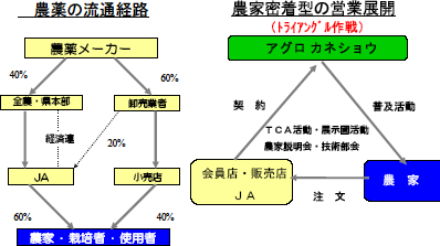 同社の営業の特徴は、農家密着型の営業です。本社の他、6支店、11営業所を全国に配置し、総勢70名のTCA(営業技術普及担当)が担当地域をカバーしています。 TCAは会員店、農協、小売店とのコミュニケーションを密にし、農家に出向いてデモンストレーションを行うなど、現場への普及活動を積極的に行い、販売店への注文につなげる営業体制を構築しています。