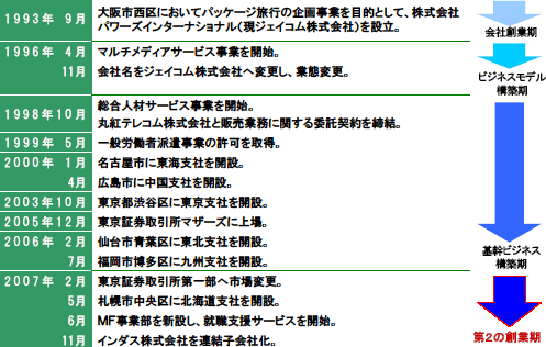 1993年9月にパッケージ旅行の企画事業を目的に設立され、96年4月にマルチメディアサービス事業に参入、同年11月に商号をジェイコム(株)に変更すると共に業態も変更。98年10月には丸紅テレコムと販売業務に関する委託契約を締結し、総合人材サービス事業を開始。2005年12月の東証マザーズ上場を経て、2007年2月23日に東証第一部に指定替えとなりました。基幹ビジネスの構築が終えた事を受けて、2007年6月にはMF事業部を新設し就職支援サービスを開始。更に同年11月には体育会系学生の就職支援を行うインダス(株)を連結子会社化する等、就職支援事業の育成・強化に取り組んでいます。 ![]() <事業内容>