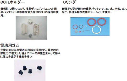 液晶表示装置のバックライトに使われる冷陰極蛍光管(CCFL)のホルダー、電子部品に使われるOリング、電池用ゴム等がある。