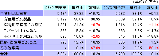 事業は、自動車の内装照明の光源向けや各種センサ向け、或いは液晶表示装置で使われる冷陰極蛍光管(CCFL)ホルダー、Oリング、電池用ゴム等に使われる工業用ゴム事業、点滴用ゴム栓や腰部クッション等の医療・衛生用ゴム事業、及び複合製品等のその他事業に分かれる。 08/3期の売上構成比は、それぞれ、87.3%、12.7%。工業用ゴム事業は、更に彩色用ゴム製品(売上構成比50.8%)、弱電用高精密ゴム製品(同 21.2%)、卓球のラケット用ラバー等のスポーツ用ゴム製品(同 5.3%)、その他工業用ゴム製品(同 10.0%)に分かれる。 彩色用ゴム製品(売上構成比50.8%)