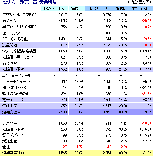 売上高は前年同期比10.7%減の7,873百万円、営業利益は同19.6%減の844百万円(配賦不可費用控除前)。真空シールの売上が太陽電池用各種製造装置向けに伸びたものの、半導体製造装置向けが中心の石英、シリコン、セラミックス等の売上が減少した。(石英坩堝、シリコン製品の一部は太陽電池関連事業に異動) 太陽電池関連事業( 同 21.8%)