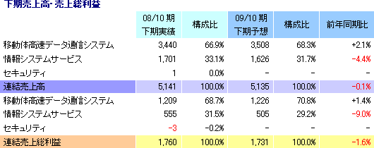 ![]() 移動体高速データ通信システム事業、情報システムサービス事業共に厳しい事業環境が予想されるものの、前期に(株)トラスティッド・ポイントを解散したため販管費が減少、営業利益は同5.5%増加する見込み。カテナ(株)を中心にした持分法適用会社の寄与に加え、特別損失がなくなるため当期純利益は同30.7%増加する見込み。 (2)セグメント別売上高・売上総利益