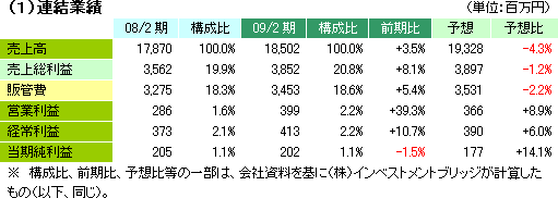 ![]() 中国産冷凍餃子中毒事件等の影響により国産原料を使用した漬物の需要が拡大する中、積極的な営業活動や新製品の投入により、漬物、惣菜等の自社製品が量販店(スーパー等)向けに伸びた。利益面では、製品の売上構成比が上昇した事や原材料野菜の価格安定等により売上総利益率が0.9ポイント改善。営業開発人員の増員や売上増及び取引先の拡大による物流費増等で販管費が増加したものの、売上総利益の増加で吸収、営業利益が同40%弱増加した。 営業利益に比べて、経常利益の伸びが低いのは、受取配当金が減少する一方、投資有価証券償還損を計上したため。固定資産除却損40百万円など特別損失49百万円を計上したため、当期純利益は同1.5%減少した。 尚、売上高が予想を下回ったのは、中国産野菜を使用した仕入商品が伸び悩んだため。一方、相対的に利益率の高い製品の好調で各利益段階で予想を上回った。 ![]() ![]() ![]() (4)トピックス