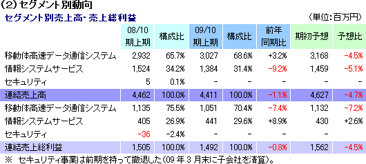 事業は、移動体高速データ通信システム事業と情報システムサービス事業に分かれ、売上構成比は、前者が69%、後者が31%(09/10期上期)。