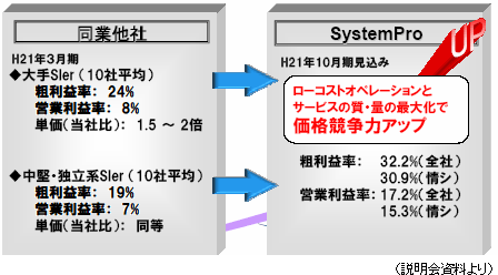 企業業績の悪化によりIT投資を抑制する動きが強まっており、業務システムの開発で延期や規模縮小が相次いだ。加えて、広告収入の減少でポータルサイト等の新規コンテンツ開発も減少したため、売上高は前年同期比9.2%減少した。ただ、不採算案件の一巡とプロジェクト管理の徹底により売上総利益が増加した。