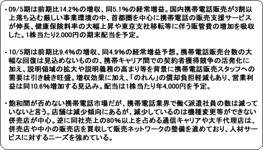 ![]() 携帯電話販売台数の大幅な回復は見込めないものの、携帯キャリア間での契約者獲得競争の活発化に加え、消費者に対する説明領域の拡大や説明義務の高まり等を背景に、携帯電話販売スタッフへの需要は引き続き高水準で推移するとみている。加えて、首都圏等でのシェアアップも見込まれ、総合人材サービスの売上が伸びる。利益面では、増収効果に加え、「のれん」の償却負担の減少もあり、営業利益が同10.6%増加する見込み。 ![]() 総合人材サービス事業