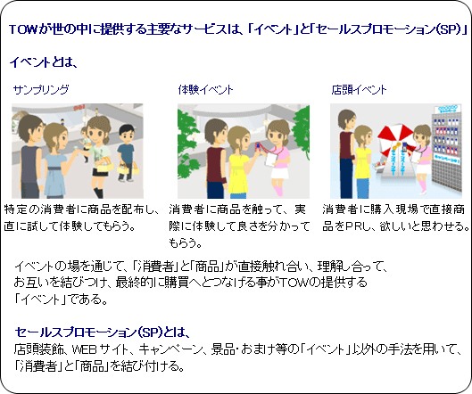 当面の目標は、2012年6月期に売上高14,910百万円、経常利益1,230百万円(売上高経常利益率8.2%)。「イベント及びプロモーションを通して人と人とのコミュニケーションを大切に心豊かな社会作りに貢献すること」と言う企業理念を再認識し、現状に即した新たな目標達成を目指している。 ![]() (3)計画達成のための施策