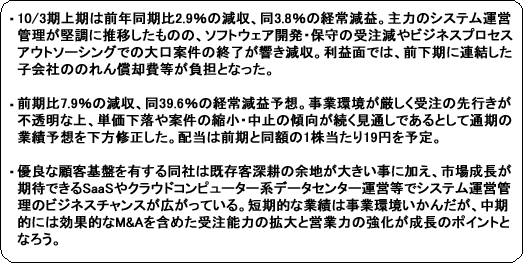 IT投資の落ち込みを受けて、10/3期上期は同業他社も厳しい決算となった。同社も減収・減益を余儀なくされたが、システム運営管理事業が下支えとなり、相対的には健闘したと言える。