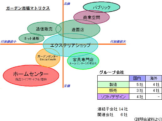 営業部門は、販売ルート別に設計・施工が必要な工務店向け「プロユース」、ホームセンターへの卸売を中心にした一般消費者向け「ホームユース」、「e-コマース・通信販売」、「輸出」に分かれる。個別ベース売上構成比は、それぞれ48.1%、46.2%、2.9%、2.8%(10/1期実績)。 「プロユース」では、プロユーザー向けのカタログ「PROEX(プロエクス)」を業界最大の約25万冊印刷し、造園業者、設計士、エクステリア施工店、商業施設等にダイレクトメールで配布している。カタログには商品を使った庭園イメージの写真が掲載されており、この写真を見ながら実際に施工する場所と庭園の簡単な図面を書いてファックスもしくはWebで発注すると、CAD(コンピュータによる設計支援システム)、CG(コンピュータ映像)を駆使した完成予想図と共に見積書を当日中に返送し、正式な注文があれば商品を1週間以内に届ける。 ![]() |