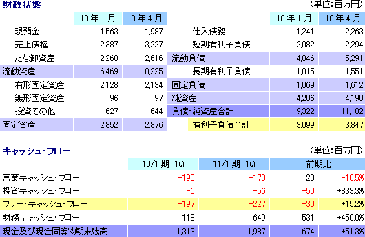 新設住宅着工戸数の低迷や公共投資の抑制に加え、春先の天候不順もあり、第1四半期は例年になく厳しい事業環境となった。同社においては、建材関係の販売強化や全国有力施工店を組織化した「リフォームガーデンクラブ」を中心とする施工店との取組み効果によりプロユース部門の売上が増加したものの、ホームセンター業界における春商戦の立ち上がりの遅れや会計制度の改正に伴う在庫圧縮等の影響を受けたホームユース部門が落ち込みが響いた。利益面では、ほぼ前年同期並みの売上総利益率を維持した事に加え、配送拠点の整理や在庫圧縮による物流費の削減等で販管費も減少したものの、減収の影響をカバーできず同6.2%の営業減益。為替差益の減少(40百万円→18百万円)や金融費用の増加(19百万円→23百万円)で営業外損益が悪化した他、税負担の増加もあり四半期純利益は同38.2%減少した。 (2)財政状態及びキャッシュ・フロー(CF)