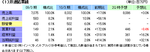 事業は、同社の施設の来場者にサービスを提供するデイサービス事業、有料老人ホーム等の施設の入居者を対象にサービスを提供する施設事業、及び利用者の自宅を訪問して日常生活訓練や機能訓練等を行うリハビリサービスや日常生活のお手伝いを行うホームヘルパーサービス等の介護サービスを提供する在宅サービス事業に分かれる。10/3期の売上構成比は、それぞれ38.1%、53.0%、8.9%。 ![]() |