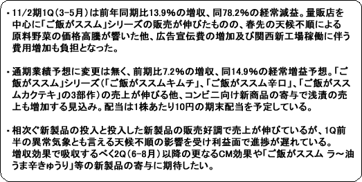 売上高は前年同期比13.9%増の5,347百万円。テレビCMの放映効果に加え、売場提案による営業強化が成果を上げ、量販店を中心に「ご飯がススム」シリーズの販売が伸びた。ただ、利益面では、春先の天候不順による原料野菜の価格高騰で売上総利益率が悪化する一方、テレビCM等による広告宣伝費の増加及び関西新工場の稼働に伴う費用増加等で販管費が増加したため、営業利益が同92.2%減少した。