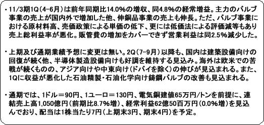 連結売上高は前年同期比14.0%増の248億30百万円。主力のバルブ事業の売上が国内外で増加した他、伸銅品事業の売上も数量の回復に加え銅相場高騰が追い風となり大きく伸びた。ただ、バルブ事業における銅、鉄スクラップ、ニッケル等の原材料高や売価政策による単価の低下に加え、低価法による評価減等もあり売上総利益率が悪化。子会社の増加に伴う販管費の増加をカバーできず営業利益は10億86百万円と同2.5%減少した。有利子負債の削減による支払利息の減少等で経常利益が10億28百万円と同4.8%増加したものの、資産除去債務に関する会計基準の適用に伴う影響額3億93百万円など特別損失4億11百万円を計上したため、四半期純利益は2億99百万円と同4.0%減少した。為替レートは、1ドル=90.74円(前期通期実績93.71円)、1ユーロ=123.67円(同130.51円)。電気銅建値は693,333円/トン(同620,000円/トン)。 主要子会社では、建築設備向けの回復で東洋バルヴの売上・利益が増加した他、半導体製造設備向けを手掛けるキッツエスシーティーが売上の急増で損益が大幅に改善。一方、水道局向けの減少で清水合金製作所の売上が減少した他、原材料高で青黄銅バルブなどを手掛けるキッツタイが増収ながら減益。稼働率の低下で石油精製・石油化学向け鋳鋼バルブを手掛けるキッツ閥門(中国・昆山)も売上・利益が減少。また、前期に買収したドイツ子会社Perrin GmbH(ペリン社)も利益計上には至らなかった。 ![]() バルブ事業