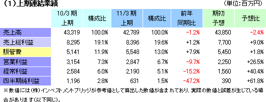 売上高は前期比7.4%減の276.3億円、営業利益は同12.5%減の6.3億円。下期の損益改善により通期では黒字を確保できる見込み。総合ビルマネジメント事業が賃貸代行のフリーレント終了及び稼動率の改善により前期の下期に比べて営業損益が4.0億円改善する他、デベロップメント事業も外部受注の強化で営業損益が1.3億円改善する見込み。一方、新店舗の開店費用でフーズ事業の損益が0.1億円悪化する他、グループ会社2社吸収合併に伴う損失0.6億円が発生する。
