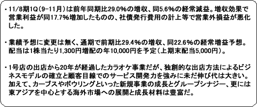 連結売上高は前年同期比29.0%増の61.3億円。9月に子会社化した(株)スポルトが寄与した他、「女性専用の30分フィットネス」として業界内で独自のポジションを確立しつつあるカーブスの売上が伸長。主力のカラオケも前期に新規出店した店舗の寄与や大規模リニューアルの効果で売上が増加した。利益面では、新規出店や大規模リニューアルの影響で売上総利益率が低下した他、販管費が増加したものの増収効果で吸収。営業利益は2.9億円と同17.7%増加した。社債発行費用0.6億円の計上等で営業外損益が悪化した他、資産除去債務会計基準の適用に伴う影響額0.6億円など1億円強を特別損失に計上したものの、(株)スポルトの連結子会社化に伴う負ののれん発生益11.9億円を特別利益に計上したため、四半期純利益が11.8億円と大幅に増加した。