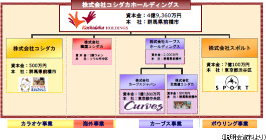 1954年に都内で飲食店として創業した同社だが、現在、社長を務める腰髙博氏のリーダーシップの下、90年にカラオケボックス事業に参入。レーザーディスクを使ったスナックやバー等でのカラオケから通信システムを活用したカラオケボックスへ需要がシフトする流れをつかみ事業を軌道に乗せた。95年8月の腰髙博氏の社長就任以降は、営業不振等で撤退するカラオケボックスを再生利用する出店モデル(居抜き出店)を開発し業容を拡大。2000年3月には株式会社コシダカに組織及び名称を変更した。また、06年には(株)カーブスジャパンのフランチャイジーとしてフィットネス事業に進出。07年6月のJASDAQ上場を経て、08年10月に(株)カーブスジャパンを子会社化した。更に、10年9月には純粋持株会社体制へ移行すると共に、日本におけるボウリング場運営事業のパイオニアであり、ボウリングを通じた周辺地域の健康増進活動に取り組む(株)スポルトを子会社化(議決権の99.9%を取得)した。