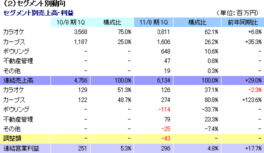 売上高が38.1億円と前年同期比6.8%増加したものの、新規出店やリニューアル等の先行投資負担からセグメント利益は1.2億円と同2.3%減少した。第1四半期末の店舗数は314店舗(前期末は309店舗)。5店舗(全て居抜き出店)の新規出店を行うと共に、17店舗で集客力の維持・拡大を図るべく、内外装の一新と料金等の営業施策の見直しを同時に行う大規模リニューアルを実施した。また、9月の定例グランドメニュー改定と10月に開始した「Bグルフェア(全国B級グルメフェア)」第2弾等、飲食メニューの多様化と質的向上を図り飲食売上の拡大にも努めた。韓国での店舗展開に向けた市場調査も進行中である。