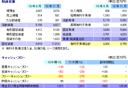 売上高6.4億円、セグメント損失1.1億円。同社グループが培ってきた「居抜き出店方式」のノウハウを活用し、既存ボウリング場の再生による店舗展開を進めており、第1四半期は1店舗を出店した。また、全店舗で「健康ボウリング教室」を定期的に開催し、若い頃にボウリングを楽しんだ中高年層の掘り起こしと固定客化にも取り組んでいる。期末店舗数は13店舗。この他、(株)スポルトの連結子会社化に伴い、同社が手掛ける不動産管理事業を報告セグメントに追加した他、10年10月に群馬県高崎市に開設した温浴施設「箕郷温泉まねきの湯」(居抜き方式にて出店)の収益をその他として計上している。 (3)財政状態及びキャッシュ・フロー(CF)