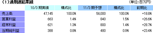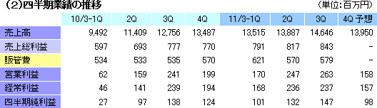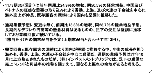 売上高は前年同期比24.9%増の420.4億円。中国及びベトナムの旺盛な需要の取り込みにより香港、上海、及び大連の子会社を中心に海外売上が伸びた他、需要の回復と既存顧客の深耕により国内も堅調に推移した。利益面では、円高の影響で売上総利益率がわずかに低下。前年の8月に設立した大連の子会社が期初から本格的に活動を開始している事や増収に伴う変動費の増加、更には貸倒引当金繰入額54百万円の計上等もあり販管費も増加したものの増収効果で吸収。営業利益は6.8億円と同46.9%増加した。持分法投資損益(△9百万円→26百万円)の改善で同50.5%の経常増益。税負担が増加したものの、四半期純利益は同44.4%増加した。