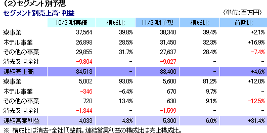 売上高は前期比16.9%増の314.5億円、営業利益は6.7億円(前期は3.4億円の損失)を計画。下期は稼働率の改善と客単価の上昇でビジネスホテル事業の既存事業所の損益が大幅に改善する見込み。またリゾートホテル事業においては、マスメディアの活用、北海道エリアの地域強化策、インバウンド強化、商品プラン強化等のプロモーションの継続により更なる稼働率改善にも取り組む。通期では、ビジネスホテル事業において、09/3期に開業した5事業所の営業利益が2.8倍に拡大(1.1億円→3.1億円)する他、10/3期開業の6事業所も営業損益が大幅に改善し(△5.0億円→△1.9億円)、営業CFが黒字転換する見込み(△1.0億円→1.0億円)。また、リゾートホテル事業も、09/3期オープンの函館ベイの営業損益が改善すると共に営業CFが増加する他、10/3期オープンの高山も営業損益が改善し(△2.4億円→△0.9億円)、営業CFが黒字転換する見込み(△0.1億円→0.9億円)。 その他の事業