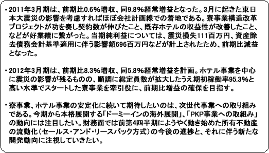 2011年3月期は、前期比0.6%増収、同9.8%経常増益となった。会社側は3月に起きた東日本大震災により、売上高936百万円、経常利益765百万円が減少したと推定しており、この影響を考慮すればほぼ会社計画で着地したことになる。主力の寮事業、ホテル事業が共に堅調に推移した。当期純利益については、震災損失111百万円、資産除去債務会計基準適用に伴う影響額696百万円などが計上されたため、前期比減益に転じた。設備投資額は3,037百万円(前期実績13,203百万円)。具体的な震災の影響は、1)寮事業において東北6県からの申込減少(影響額:売上高60百万円、経常利益60百万円)、2)同じく寮事業において海外留学生の帰国・キャンセル(影響額:売上高20百万円、経常利益20百万円)、3)ビジネスホテルでの予約キャンセル・宿泊減少(影響額:売上高156百万円、経常利益125百万円)、4)リゾートホテルでの予約キャンセル・宿泊減少(影響額:売上高700百万円、経常利益560百万円)、など。なお、特別損失には災害による損失111百万円が計上された。 ![]() 寮事業