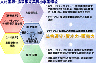 事業は、携帯電話業界向けを中心に、情報通信、金融、アパレル・美容等を顧客とする総合人材サービス事業と携帯電話ショップ運営のマルチメディアサービス事業に分かれ、11/5期は前者の売上高が全体の97.2%を占めた。総合人材サービス事業は契約形態により、派遣契約、業務委託契約(同社から見れば業務の受託)、及び紹介予定・職業紹介契約に分かれ、セグメント内の売上構成比は、それぞれ68.1%、31.8%、0.1%。また、マルチメディアサービスでは、各通信キャリアと丸紅テレコム(株)との三者間契約により、関西地区でドコモショップ1店舗、ソフトバンクショップ1店舗を運営している。