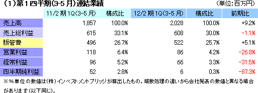 ![]() 前年同期比9.2%の増収、同31.5%の経常減益