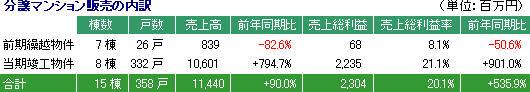 売上高9.3億円(前年同期比79.7%減)、売上総利益0.8億円(同88.1%減)。戸建住宅18戸(前年同期は33戸)及び販売用賃貸不動産1物件を販売。前年同期に複数の1棟卸マンション等の売却があった反動で大幅な減収・減益となったが、期初の想定に沿った着地。尚、戸建住宅に限れば、売上高7.4億円(前年同期比46.1%減)、売上総利益0.9億円(同55.1%減)。