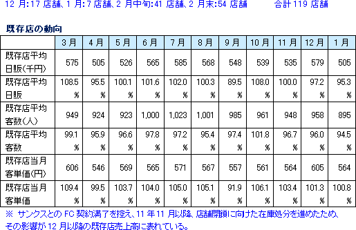 訴訟の和解を受けて12年1月に(株)ローソンとフランチャイズ契約を締結した。同社は契約締結に当たってのポイントとして、①(株)ローソンが構築しているSCM(サプライ・チェーン・マネジメント=商品調達力、供給力)、②ポイントカード「Ponta」を活用したCRM(カスタマー・リレイションシップ・マネジメント=顧客分析、囲い込み)、③テレビなど各メディアを活用したプロモーション(=新規顧客確保、店舗支援)、更には、④これまでに同社が手掛けてきた独自サービスが継続できる事及び⑤出店地域の原則自由化(出店可能エリア及び店舗ネットワークの拡大余地)を挙げている。「ローソン」ブランドの下での開店準備が進んだ店舗から順次営業を開始しており、3月末の営業店舗数は48店舗。足元の3月、4月は、閉鎖期間の影響からタバコや酒類が苦戦しているが、ファストフードやデザートが大きく伸びている他、米飯・調理麺も好調。売上構成比の良化で粗利率の改善が見込まれると言う。 尚、契約締結に伴い、看板の付け替えに伴う固定費除去費等の負担金として、契約金収入18億円を(株)ローソンから受け取った。 (3)今後の出店計画