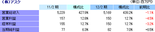 営業総収入は前期比6.1%減の268.8億円。内訳は、コンビニ事業(直営店売上高)が同7.7%減の198.6億円(加盟店の売上を含めた全店売上高は同7.4%減の231.5億円)、ビジネスホテル事業が同7.8%減の1.6億円、マンションフロントサービス事業の(株)アスクが同1.1%減の51.6億円、クリーニング事業の(株)FA24が同3.7%減の11.7億円。利益面では、ほぼ前期並みの営業総利益率を確保した事に加え、人件費、ライセンスフィー、賃借料、減価償却費等、コンビニ事業を中心に販管費も減少したが、減収の影響をカバーできず営業利益が3.3億円と同43.7%減少。営業外損益(有価証券運用損益や不動産賃貸損益が悪化)や特別損益(後述)の悪化で3.6億円の当期純損失となった。 特別損益について