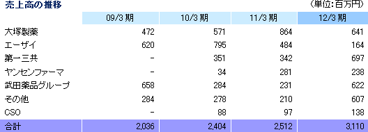 CSO(Contract Sales Organization:医薬品営業受託)事業と言うと一般的にはMRの派遣事業だが、同社は特定の疾患領域にフォーカスすると共にCRO事業で蓄積したノウハウを活用する事で、プロダクトマーケティング業務や市販後データの企画・収集業務の受託を拡大させていく考え(人材派遣サービスではなく、同社が主体となって業務を進める請負サービス)。12/3期は、プロダクトマーケティング業務でCNS領域の新規案件の受注に成功した。