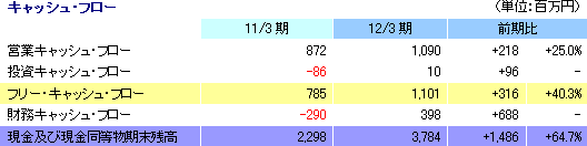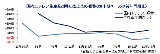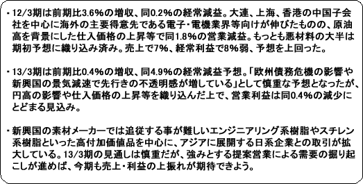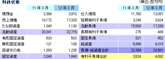 売上高は前期比3.6%増の577.9億円。合成樹脂の基礎原料であるエチレンの11年度国内生産量は6,475千トンと前年度比7.5%減少したものの、同社においては、大連、上海、香港の中国子会社を中心に海外の主要得意先である電子・電機業界等向けが伸びた。利益面では、原油高を背景にした仕入価格の上昇で売上原価(525.2億円)が同4.0%増と売上の伸びを上回り、売上総利益が減少。売上の増加に伴う運賃等の変動費の増加や海外拠点強化等に伴う人件費の増加を全社的な経費削減で吸収して販管費が減少したものの、営業利益は前期の実績をわずかに下回った。ただ、為替差損の減少(27百万円→13百万円)等で営業外損益が改善。投資有価証券売却益(48百万円)の増加等で特別損益も改善し、当期純利益は5.3億円と同6.0%増加した。 期末配当は1株当たり1円の増配とJASDFAQ上場10周年記念配当2.5円を加えた10.5円を予定している(1円増配した上期末配当と合わせて年17.5円)。 尚、予想との比較では、海外の好調に加え、国内も予想以上に底堅く売上が上振れ。原価率の上昇等は当初から織り込んでいたため、営業利益は6.4%予想を上回った。 ![]() ![]() (2)財政状態及びキャッシュ・フロー(CF)