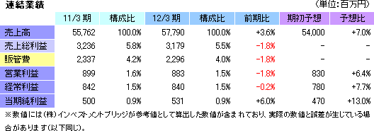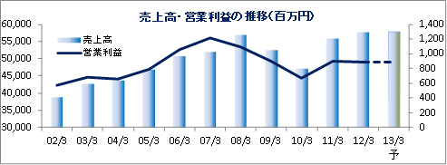 株式上場後の10年間で連結売上高は387億円(上場した02/3期)から577億円(12/3期)へ1.5倍に拡大した。