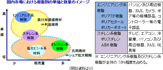 売上高の75%程度を占めるエンジニアリング系樹脂やスチレン系樹脂は付加価値が高く、海外では成長が続いており、成熟しつつある国内でも需要は堅調。 【同社が扱う合成樹脂原料の特徴】