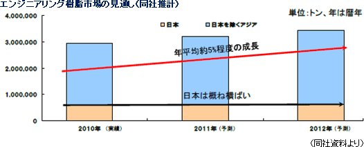 販売先業種はOA・事務機器と家電・電子が全体の51%(個別ベース、以下同じ)程度を占めており、次いで玩具・その他が25%程度。その他、建材10%程度、医療機器7%程度、自動車5%程度、容器・化粧品2%程度と、様々な業種に取引先が広がっている。同社が強みを有するエンジニアリング樹脂市場は国内では概ね横ばいだが、アジアでは5%以上の伸びが予想されている。また、同社は、アジア、中国等の新興市場での販売を強化している他、新しい事業分野の開拓や省エネ・省資源の推進にも取り組んでおり、この一環として、「技術」、「コスト」、「消費地」を念頭に置いた最も合理的な世界最適生産体制の構築を進めている。 ![]() |