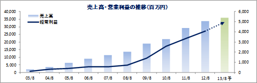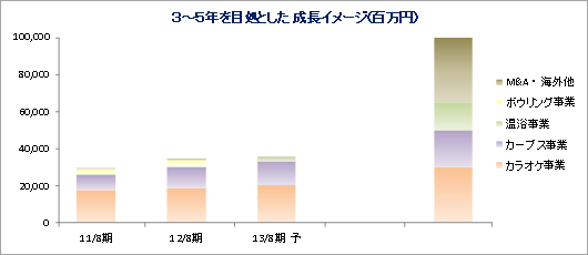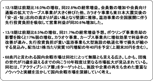 同社の強みは、成熟した国内市場にあっても高い成長を可能にする業態開発力と、今後の更なる成長が期待できるアクティブシニア層向けマーケットでの実績。カラオケやフィットネスと言った既に社会に存在し誰もが知っている業種において、視点や取り組み方を変えると共に新たな顧客層をターゲットとする事で新しい業態を開発し(新たなサービスや運営手法を生み出し独自のビジネスモデルを確立)、08/8期以来、増収増益を続けているのはその証左である。また、地域密着の事業展開が、アクティブシニア層の開拓はもとより、ファミリー層等の取り込みにつながっており、そのノウハウや経験が大きな財産となっている。加えて、カラオケ事業の成功の一因でもある「居抜き出店」の実績を積み上げてきた事で、施設の再生や企業の再生といった面でもノウハウと経験の蓄積が進んでおり、育成中の温浴事業や黒字化に目処を付けた後に売却(12年10月)したボウリング事業においては、こうした「再生」ノウハウが地域密着による顧客開拓手法と共に活かされている。 ![]() |
