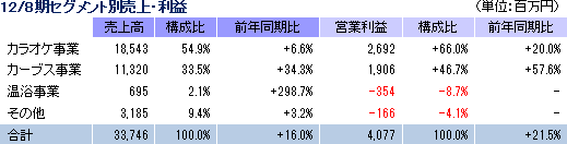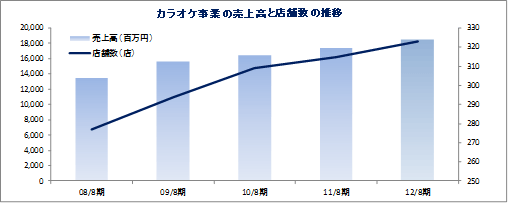 売上高は前期比16.0%増の337億46百万円。店舗数及び会員数共に大きく伸びたカーブス事業の売上が同34.3%増加した他、東日本大震災後の「安・近・短」志向の高まりが追い風となり主力のカラオケ事業の売上も同6.6%増と堅調に推移した。