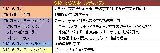 グループは、純粋持株会社である(株)コシダカホールディングスと、カラオケ事業、カーブス事業、温浴事業、及び不動産管理や知的財産管理を手掛ける連結子会社7社及び韓国でカラオケ事業を手掛ける非連結子会社1社。カラオケ事業は(株)コシダカが国内で323店舗を展開しており、(株)韓国コシダカが韓国ソウル市内で2店舗を運営。カーブス事業は、中間持株会社(株)カーブスホールディングスの下、連結子会社(株)カーブスジャパンが女性専用フィットネスクラブ「Curves(カーブス)」のFC本部の運営と直営店展開を手掛け、連結子会社(株)北海道コシダカ及び(株)シュクランがフランチャイジーとして直営店を多店舗展開している。また、11年11月に多店舗展開を本格化した温浴事業は(株)コシダカが新規事業として育成中の事業であり、6店舗を展開している(店舗数は、いずれも12年8月末)。