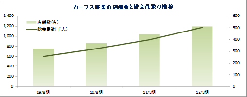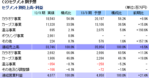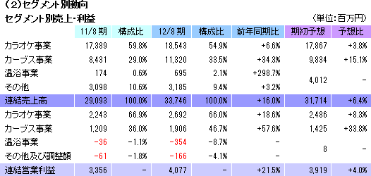 事業は、「カラオケ本舗まねきねこ」(郊外中心)や一人カラオケ専門店「ワンカラ」(都心や地方都市の繁華街で展開)を運営するカラオケ事業、“女性専用30分健康体操教室”として中高年齢層をターゲットに女性専用フィットネスクラブ「Curves(カーブス)」を展開するカーブス事業、新規事業として育成中の温浴事業(各種の温浴設備を備えた施設の運営。「居抜き出店方式」のノウハウを活用し店舗展開)、及び不動産管理事業等のその他に分かれる。12/8期の売上構成比は、カラオケ事業54.9%、カーブス事業33.5%、温浴事業2.1%、ボウリング事業8.8%(12年10月に撤退)、その他0.7%。
