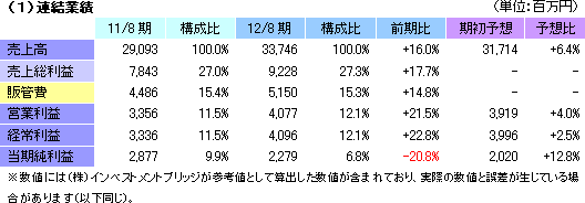 ![]() 前期比16.0%の増収、同22.8%の経常増益