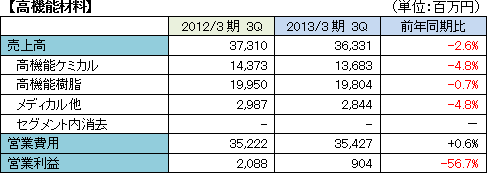 景気減速による市況の低迷、円高の影響などで、売上高は前年同期比 -6.4%の1,865億円。内訳は、数量差で -104憶円、価格差で -18億円、円高の影響で -6億円。営業利益は同 -39.8%の減益。こちらも、数量(-33億円)、価格(-18億円)、為替(-6億円、特にユーロ)、原料・原価(-52億円)など各要因でマイナスとなり、コストダウンを15億円行ったが、補いきれなかった。 11月以降の円安と株価の上昇で、営業外費用において9億円の減少(為替評価損)、特別損失において7億円の減少(投資有価証券評価損)があったが、数量減少及び価格低迷により、「減収・減益」となった。 ![]() 汎用ゴム、特殊ゴムとも数量はマイナス。ラテックスも主力の手袋用が円高の影響などで数量が減少した。 化成品は、国内向けが堅調で数量は微増だった。 ![]() 高機能ケミカルでは、合成香料、トナーなどの化学品が欧州景気の低迷、円高などで不振だった。一方リチウムイオン電池関連材料は増収だった。 高機能樹脂では、偏光板接着問題により販売数量低下が続いていた光学フィルムが、接着方式を変更したことによる問題解決とガラス薄膜化対応によって第2四半期を底に第3四半期から持ち直し増収となった。 ![]() ![]() 負債面では、短期借入を中心に有利子負債を33億円増加させたものの、利益剰余金の増加など自己資本が82億円増加したため、自己資本比率は前期末の42.5%から43.7%へ上昇した。 (4)株式会社トウペへのTOB