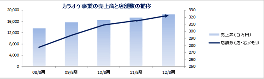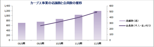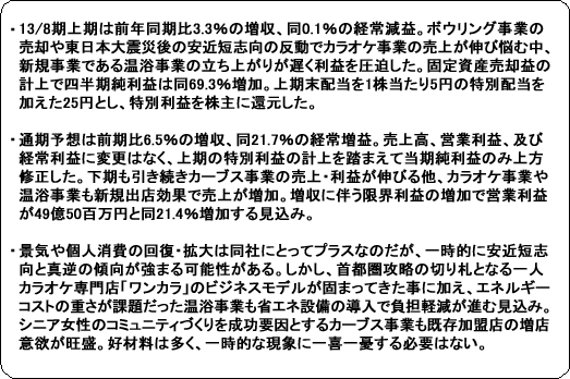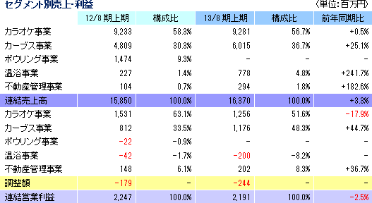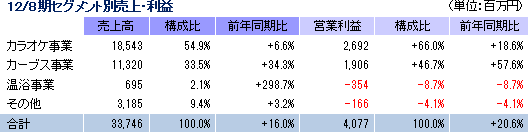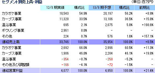 事業は、「カラオケ本舗まねきねこ」(郊外中心)やひとりカラオケ専門店「ワンカラ」(都心や地方都市の繁華街で展開)を運営するカラオケ事業、“女性専用30分健康体操教室”として中高年齢層をターゲットに女性専用フィットネスクラブ「Curves(カーブス)」を展開するカーブス事業、新規事業として育成中の温浴事業(各種の温浴設備を備えた施設の運営。「居抜き出店方式」のノウハウを活用し店舗展開)、及び不動産管理事業等のその他に分かれる。12/8期の売上構成比は、カラオケ事業54.9%、カーブス事業33.5%、温浴事業2.1%、ボウリング事業8.8%(12年10月に撤退)、その他0.7%。