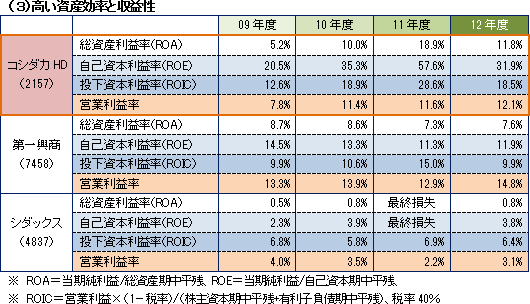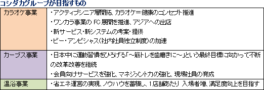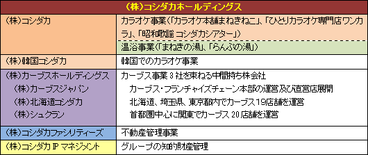 グループは、純粋持株会社である(株)コシダカホールディングスと、カラオケ事業、カーブス事業、温浴事業、及び不動産管理や知的財産管理を手掛ける連結子会社8社。カラオケ事業は(株)コシダカが国内で326店舗を、(株)韓国コシダカが韓国ソウル市内で2店舗を、それぞれ運営。カーブス事業は、中間持株会社(株)カーブスホールディングスの下、連結子会社(株)カーブスジャパンが女性専用フィットネスクラブ「Curves(カーブス)」のFC本部の運営と直営店展開を手掛け、連結子会社(株)北海道コシダカ及び(株)シュクランがフランチャイジーとして直営店を多店舗展開している(店舗数は直営+FC合わせて1,248店舗)。また、11年11月に多店舗展開を本格化した温浴事業は(株)コシダカが新規事業として育成中の事業であり、7店舗を展開している(店舗数は、いずれも13年2月末)。