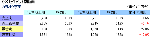 売上高は前年同期比3.3%増の163億70百万円。ボウリング事業の売却が14億74百万円の減収要因となった他、東日本大震災後に高まった安近短志向の一巡でカラオケ事業が伸び悩んだものの、加盟店の出店増とプロテイン等の通販の好調でカーブス事業の売上が伸長。育成中の温浴事業も店舗の増加で売上が2億27百万円から7億78百万円に拡大した。